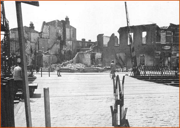 De hoekpanden werden in de namiddag van 12 mei 1940 in brand gegooid door naderende Duitsers (Gruppe De Boer).